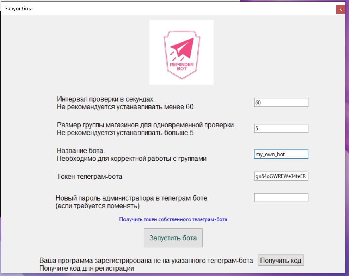 Каждый экземпляр программы рассчитан на работу только одного телеграм-бота и не предназначен для распространения. Чтобы получить программу для Вашего собственного бота, приобретите ее по ссылке